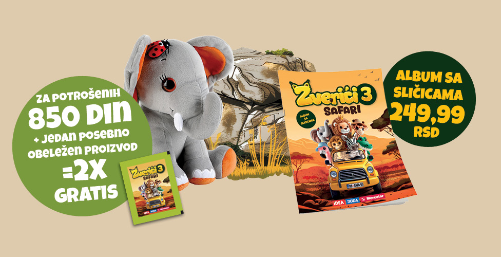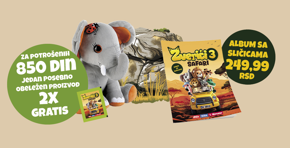 Sličice za album i bonus markice možeš dobiti od 09.03. do 10.05.2026. ili isteka zaliha prilikom svake kupovine u minimalnom iznosu od 850 dinara i jedan posebno obeležen proizvod u Idea, Roda ili Mercator prodavnicama, kao i putem Idea Online prodavnice.