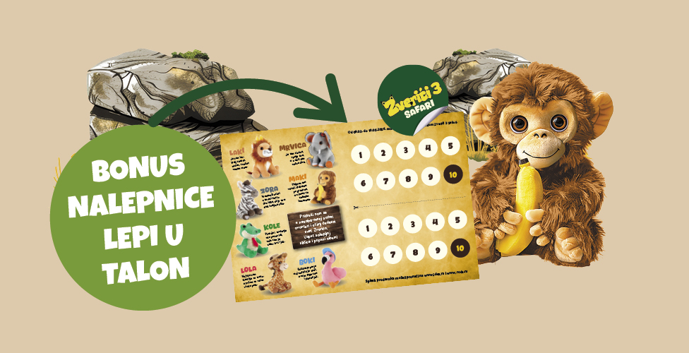 ZA SVAKIH POTROŠENIH 850 DINARA I JEDAN POSEBNO OBELEŽEN PROIZVOD, DOBIĆEŠ DVE KESICE SA SLIČICAMA. KESICA SADRŽI DVE SLIČICE I JEDNU MARKICU.