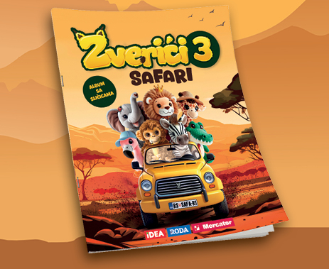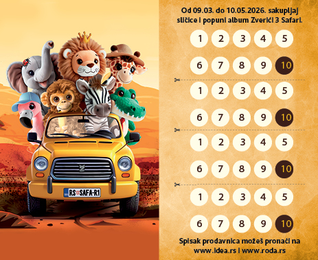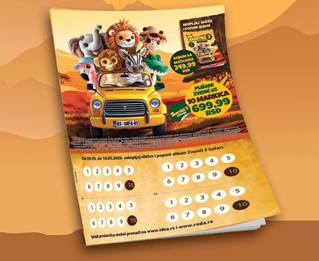 Sličice za album i bonus markice možeš dobiti od 09.03. do 10.05.2026. ili isteka zaliha prilikom svake kupovine u minimalnom iznosu od 850 dinara i jedan posebno obeležen proizvod u Idea, Roda ili Mercator prodavnicama, kao i putem Idea Online prodavnice.