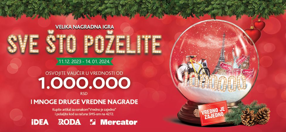 Idea, Roda i Mercator vam žele mnogo sreće tokom ove nagradne igre zato što će najsrećniji među nama osvojiti glavnu nagradu, a to je vaučer od čak 1.000.000 dinara za godišnju kupovinu u svim našim prodavnicama.